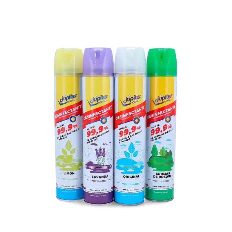 Desinfectante en aerosol Jupiter. Elimina virus, bacterias y hongos. Ideal para superficies y ambientes. Presentación de 360 ml.